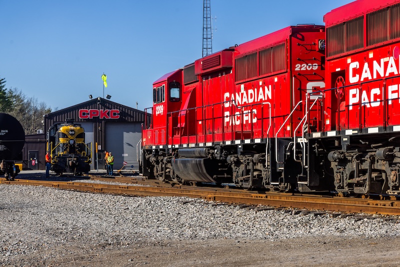 CPKC local G48 picks up SCHX 4085 at the engine house in Saratoga Springs on April 28.